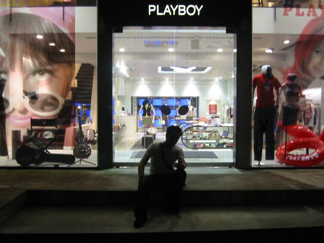 Me, cutting a dashing silhouette in front of the Playboy shop.
